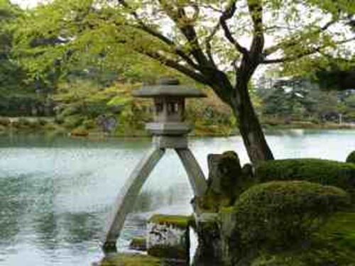 ・・徽軫灯籠石川県金沢市 加賀百万石、前田家の大名庭園手前の一枚岩の虹橋と傍らモミジの古木と三位一体・・不安定な脚に灯籠が絶妙なバランスで載っかっている。貴方の一票が私を支えています