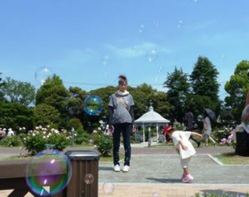 シャボン玉が青空に吸い込まれていきます。ばら園でのワンシーンです。 がんばろう! 日本。出来ることから始めます。